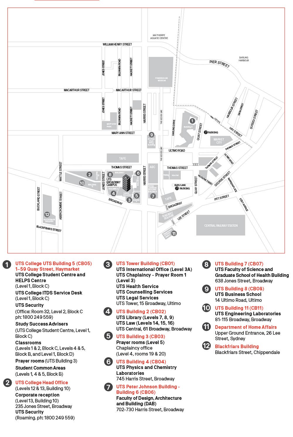 You can find the Student Centre, HELPS Centre, Welfare and Accommodation, ITDS Service Desk and classes for all UTS College English and academic programs at Location 1 on the map: